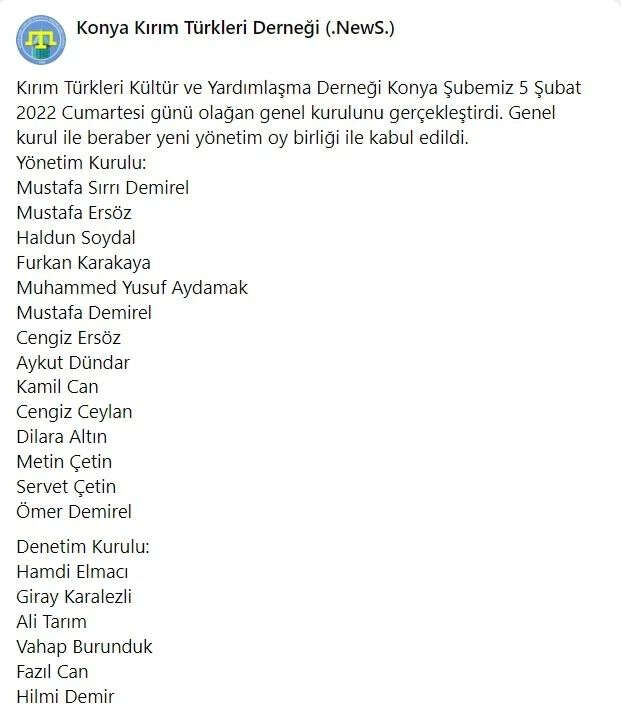 Kırım Türkleri Kültür ve Yardımlaşma Derneği Konya Şubesi, 5 Şubat 2022 tarihinde Olağan Genel Kurul Toplantısını gerçekleştirdi.