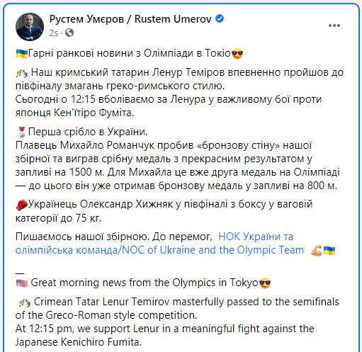 Milletvekili Umerov mesajında, "Kırım Tatarımız Lenur Temirov, Greko-Romen tarzı yarışmanın yarı finaline güvenle geçti. Bugün saat 12.15'te Japon Kenichiro Fumita'ya karşı önemli bir mücadelede Lenur'u destekliyoruz." diye kaydetti.