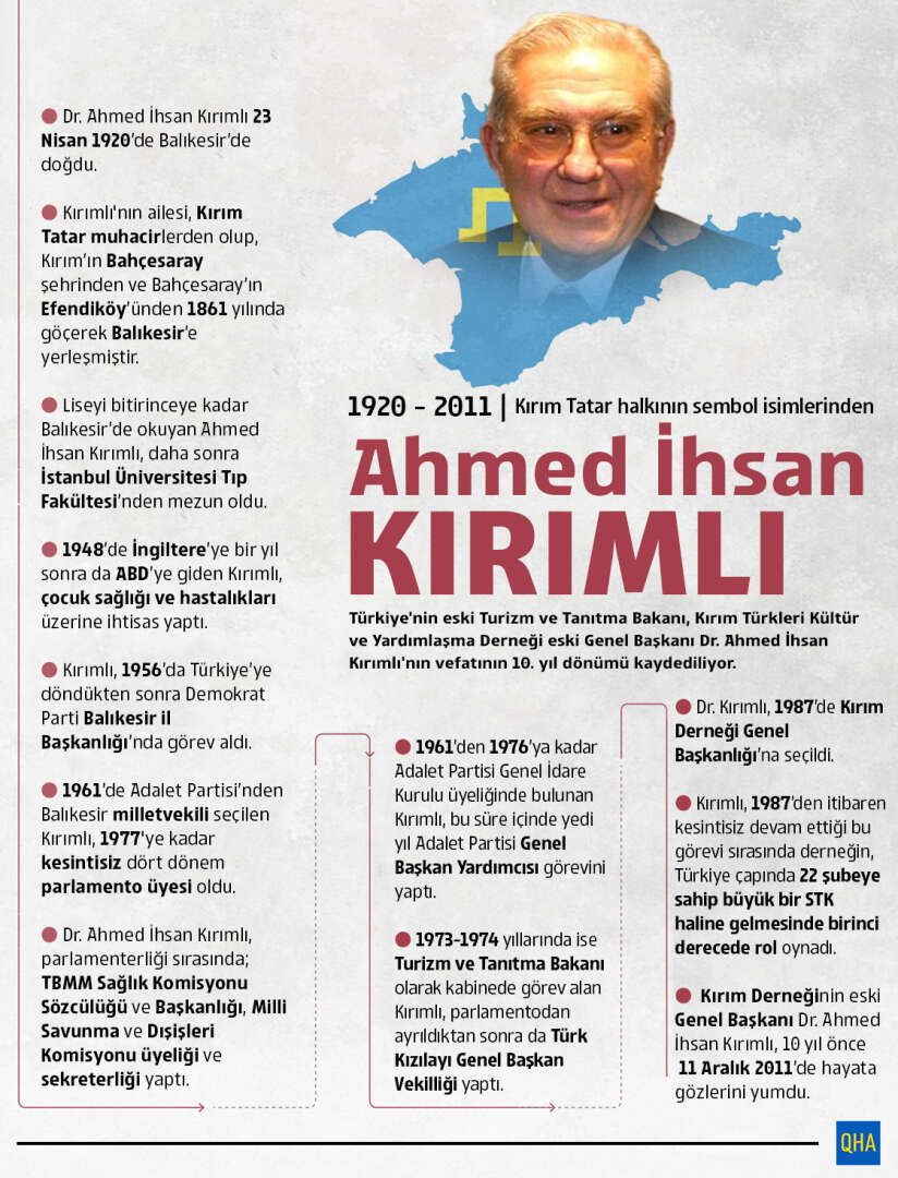 Türkiye Cumhuriyetinin eski Turizm ve Tanıtma Bakanı, Kırım Türkleri Kültür ve Yardımlaşma Derneği eski Genel Başkanı, Doktor Ahmed İhsan Kırımlı'nın vefatının 10. yıl dönümü kaydediliyor. Türkiye’deki Kırım Tatar diasporasının bugünlere gelmesinde önemli bir pay sahibi olan Kırımlı, hem siyaset hem de cemiyet hayatında ortaya koyduğu çalışmalarla, Kırım Tatar halkının sembol isimlerindendir.