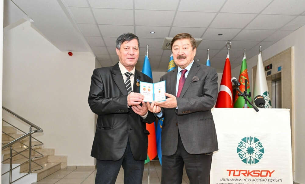 Türksoy Genel Sekreteri Düsen Kaseinov, Nogay sanatçı Koşali Zarmanbetov’a, TÜRKSOY’un 2020 yılında ilan ettiği Abay Kumanbayev yılı anısına hazırlanan madalyayı takdim etti.