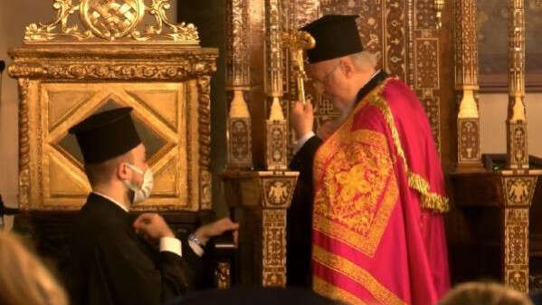 Dener Rum Ortodoks Patrikhanesi'nde 13 Şubat 2022 tarihinde yapılan ayinin ardından Patrik Bartholomeos savaş söylentilerinin sona ermesi için dua etti.