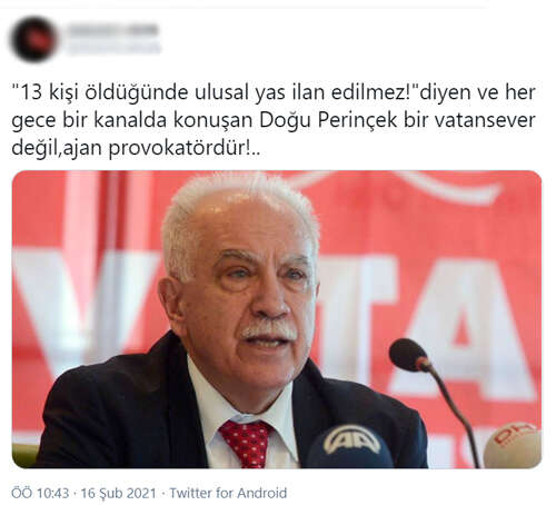 Vatan Partisi Genel Başkanı Doğu Perinçek, katıldığı televizyon programında, Irak'ın Gara bölgesinde terör örgütü PKK tarafından şehit edilen 13 Türk vatandaşı için adeta alay eder gibi gülerek skandala imza attı. "Öyle her 13 kişi öldüğünde ulusal yas olmaz" diye konuşan Perinçek'e sosyal medyada sert tepkiler geldi.