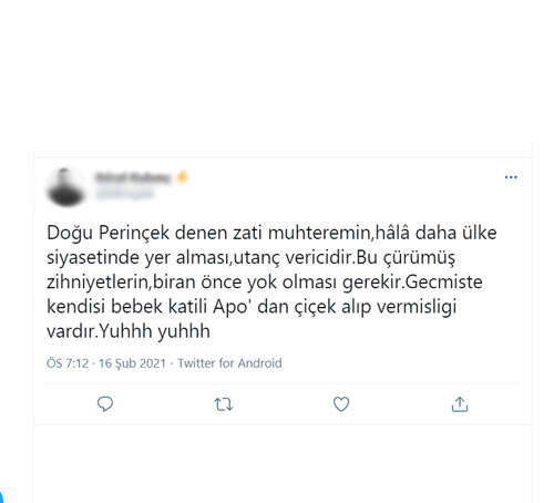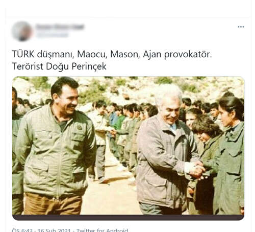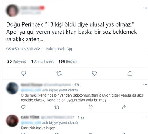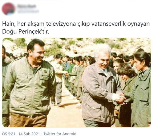 TEPKİLER GECİKMEDİPerinçek'in programda söylediği skandal sözler üzerine sosyal medyada tepkiler gecikmedi. Perinçek'i vatan hainliği ile suçlayan bazı kullanıcılar, Doğu Perinçek'in PKK elebaşı Abdullah Öcalan ile çekilmiş fotoğraflarını paylaştı. Öte yandan kullanıcılar, Doğu Perinçek'in tutuklanması gerektiğini ifade etti.