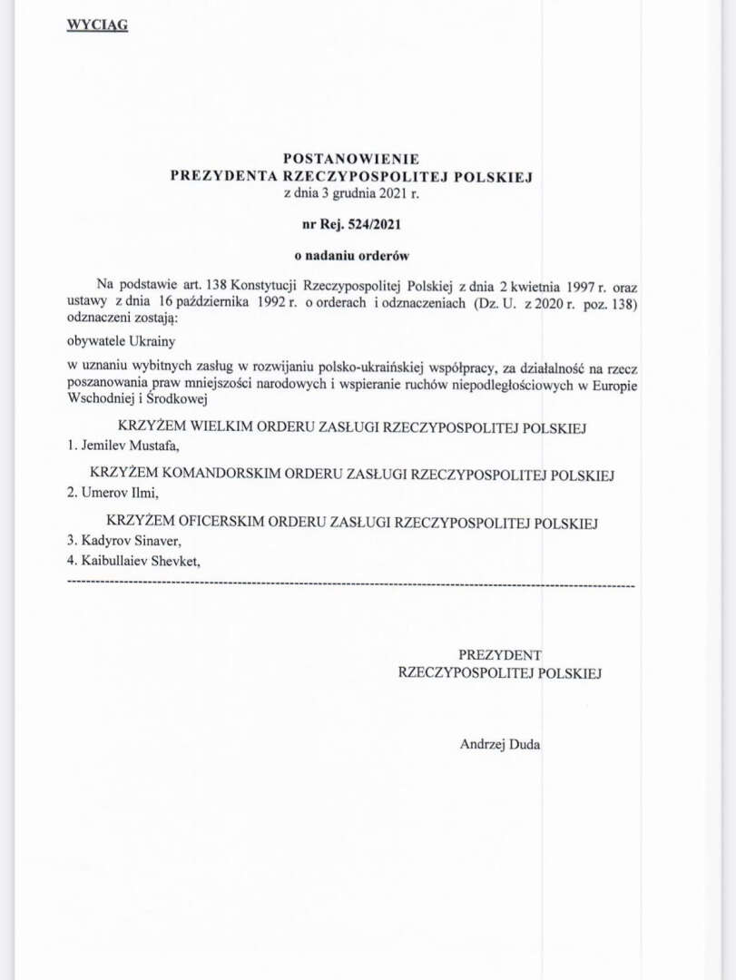 Kırım Tatar halkının milli lideri Mustafa Abdülcemil Kırımoğlu, Kırım Tatar Milli Meclisi (KTMM) Başkan Yardımcısı İlmi Ümerov, Kırım Tatar Milli Meclisi üyesi, Avdet gazetesi editörü Şevket Kaybullayev ve Kırım Tatar milli hareketi, eski siyasi tutsak Snaver Kadırov, Polonya’nın üst düzey devlet nişanına layık gördü. Polonya Cumhurbaşkanı Andrzej Duda tarafından, 3 Aralık 2021 tarihinde imzalanan kararda; 4 Kırım Tatarının, Polonya-Ukrayna işbirliğinin geliştirilmesindeki olağanüstü başarıları, ulusal azınlıkların hakları için yürüttüğü mücadele ve Doğu ile Orta Avrupa'daki bağımsızlık hareketlerine verdikleri destekleri için bu onura layık görüldüğü belirtildi.