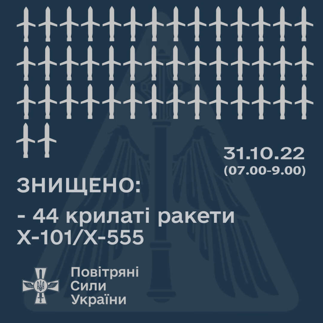 Ukrayna Hava Kuvvetlerinden yapılan açıklamada, “31 Ekim saat 07.00’da Rus işgalcileri Ukrayna kritik altyapısına yönelik birkaç dalga füze saldırısı gerçekleştirdi. Rostov bölgesi ve Hazar Denizi’nin kuzeyinde havalanan Tu-95/Tu-160 stratejik ağır bombardıman uçaklarından 50’den fazla Kh-101/Kh-555 seyir füzesi ateşlendi. 44 seyir füzesi Hava Kuvvetleri birlikleri tarafından düşürüldü” denildi.