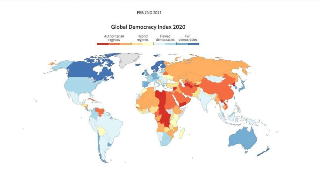 2020 Demokrasi Endeksi'nde ülkeler "tam demokrasi", "kusurlu demokrasi", "hibrit rejim" ve "otoriter rejim" olmak üzere dört kategoride sıralanıyor.