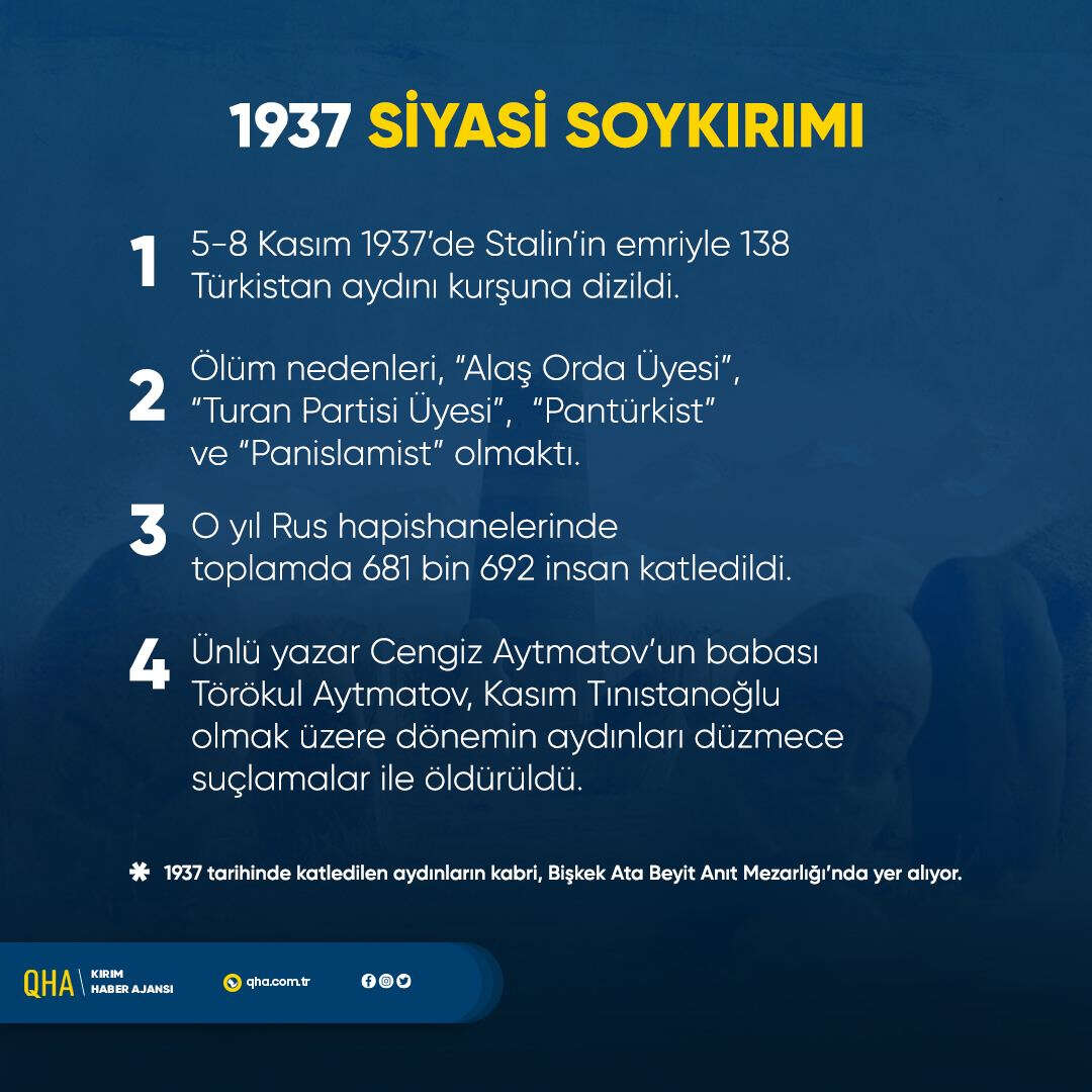 Kırgızların 1916’da Rus Çarlığı’nın baskısına karşı isyanını simgeleyen Ürkün Anıtı'nın yanı sıra Stalin döneminde 1937 yılında öldürülen 138 aydının, ayrıca dünyaca ünlü Kırgız yazarı Cengiz Aytmatov ile 7 Nisan Şehitleri’nin kabirlerin de yer aldığı Ata Beyit Anıt Mezarlığı’nda Rus emperyalizminin kurbanları için anma töreni düzenlendi. Kırgızistan’da “Esimde” (Hatırla) Araştırma Platformu'ndan genç araştırmacı Gülzat Alagözkızı QHA'ya röportaj verdi. Alagözkızı, "Stalin'in zulümlerini simgeleyen 1937 yılı soykırım yılı ilan edilsin" dedi.