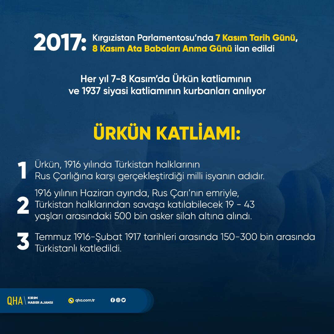 Kırgızistan’da 7-8 Kasım tarihinde Kırgızistan Tarih ve Ataları Anma Günü kapsamında çeşitli etkinlikler düzenledi. Kırgızistan Cumhurbaşkanlığı, 8 Kasım 2022 tarihinde yaptığı açıklamada, Dışişleri Bakanı Süyunbek Kasmambetov ülke yetkilileri 1916 yılındaki Ürkün, 1937’deki siyasi baskı kurbanlarını ve dünyaca ünlü yazar Cengiz Aytmatov’u mezarı başında andığını bildirdi.