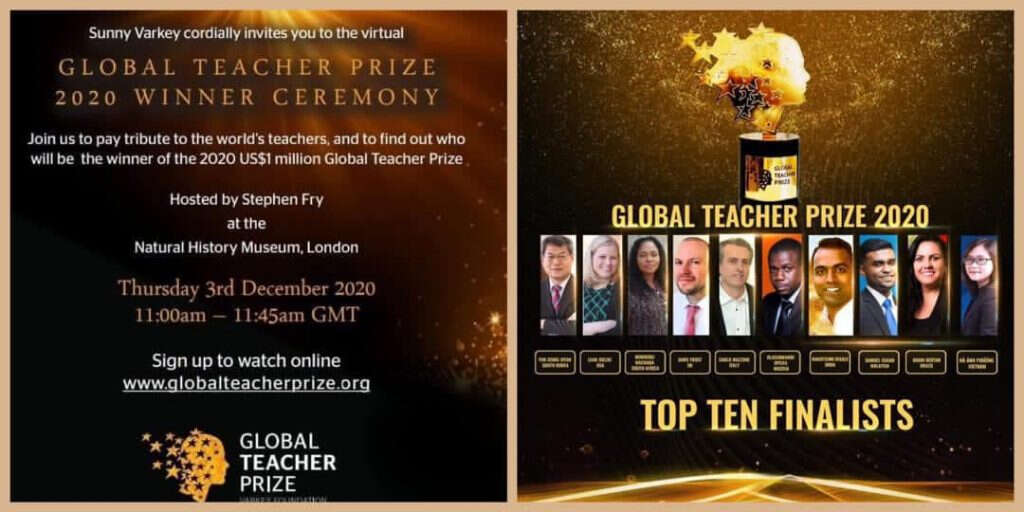 Dünyanın 140 farklı ülkesinden 12 binden fazla öğretmenin aday gösterildiği Küresel Öğretmen Ödülleri (Global Teacher Prize) sahiplerini buldu. Türkiye ve Ukrayna'dan isimler ilk 50'de yer aldı. İlk 10'a girerek 1 milyon ABD Doları değerindeki 2020 Küresel Öğretmen Ödülü'nün kazananı ise 3 Aralık 2020 Perşembe günü Londra Doğa Tarihi Müzesi'nden (London's iconic Natural History Museum) İngiliz aktör, komedyen ve yazar Stephen Fry'ın ev sahipliği yaptığı ilk sanal tören ile açıklandı.