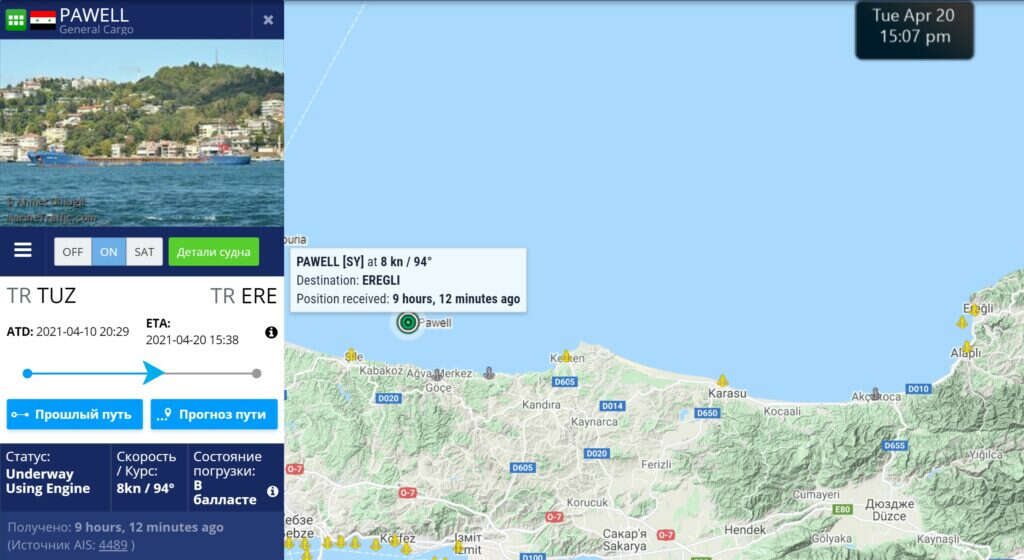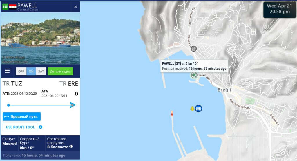 Ukrayna'da kurulan ve ayrılıkçılar ile teröristlerin işlediği suçlar, Ukrayna yasalarının ihlalleri ile ilgili bilgileri içeren Mirotvorets sitesinin haberine göre, gemi Ereğli'den Akyar'daki limana 2 bin 900 ton alçı taşı getirdi. Gemiye, 20-24 Nisan 2021 tarihleri arasında Ereğli'deki limanda EURO Gips markalı alçı karışımları yüklendiği, geminin 24 Nisan'da transponderini kapatarak Ereğli'den ayrıldığı ve işgal altındaki Akyar'a gittiği belirtildi.