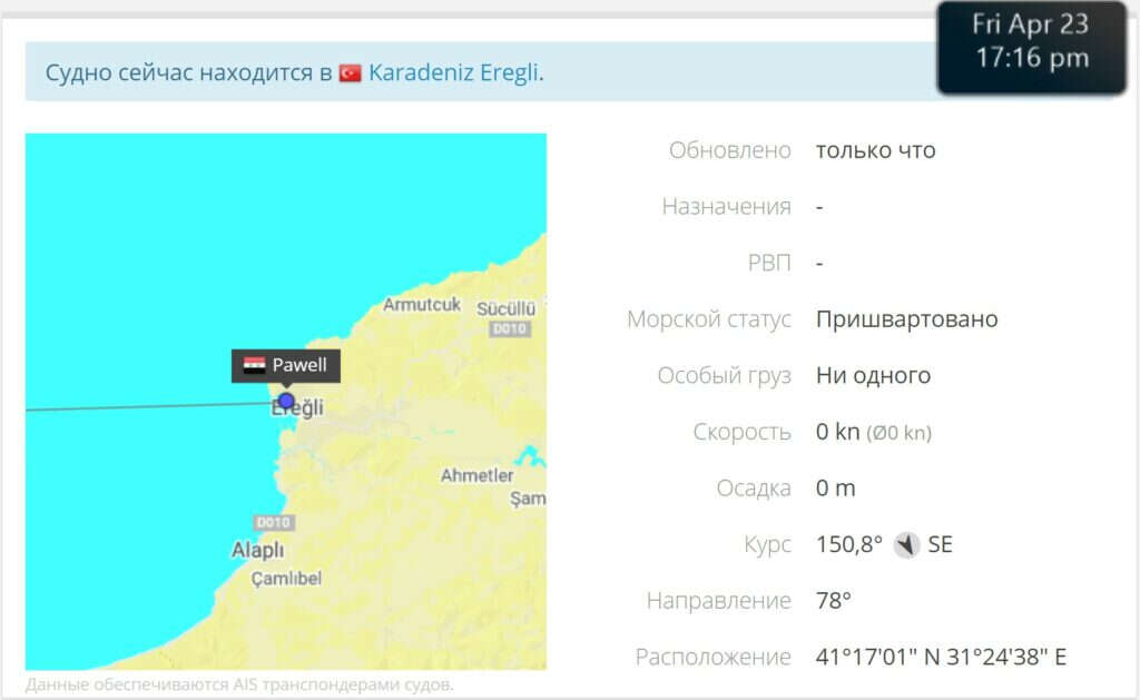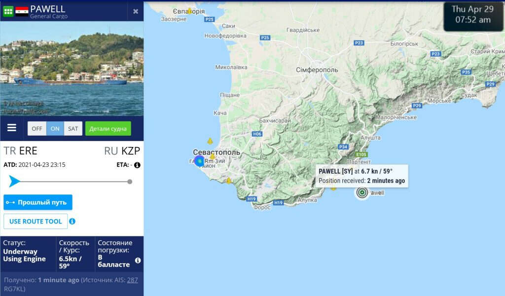 Suriye bandıralı PAWELL gemisinin, Türkiye'den Rus işgali altında bulunan Akyar'a (Sivastopol) yasa dışı şekilde yük taşıdığı bildirildi. PAWELL gemisinin, yasakları delerek Ereğli'deki limandan Rus işgali altındaki Akyar'a (Sivastopol) alçı taşı götürdü.