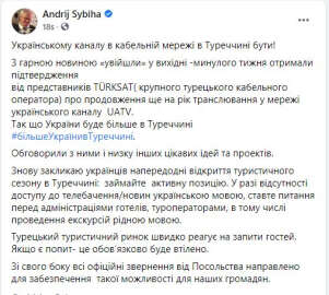TÜRKSAT yetkilileri ile UA TV'nin bir dizi fikir ve projeyi görüştüğünü de aktaran Sıbiga, Ukrayna vatandaşlarına çağrıda bulunarak, "Türkiye'de turizm sezonunun açılışının arifesinde Ukraynalıları tekrar çağırıyorum: aktif bir pozisyon alın. Ukraince televizyon / haberlere erişiminiz yoksa, otel idarelerine, tur operatörlerine ana dilinizdeki turlar da dahil olmak üzere sorular sorun. Türk turizm pazarı, misafir isteklerine hızlı yanıt verir. Talep varsa mutlaka uygulanacaktır." diye kaydetti.
