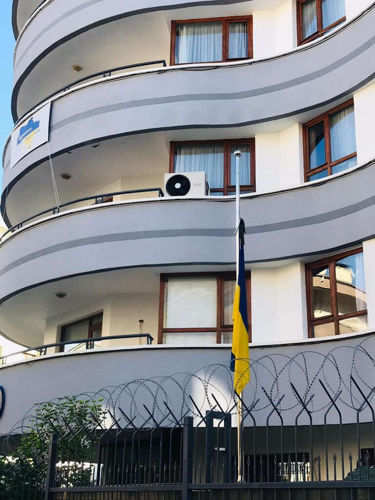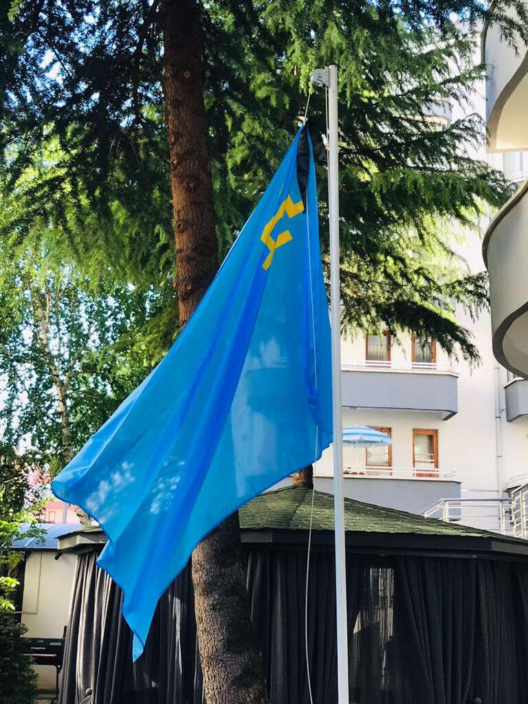 Ukrayna'nın Ankara Büyükelçiliğinde, Kırım Tatar Soykırım Kurbanlarını Anma Günü dolayısıyla devlet bayrağı yarıya indirildi ve siyah kurdeleli Kırım Tatar bayrağı göndere çekildi.