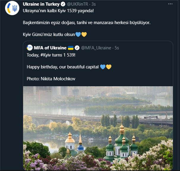 Ukrayna'nın Ankara Büyükelçiliği, bu özel güne binaen bir kutlama mesajı paylaştı. Büyükelçilik, Ukrayna Dışişleri Bakanlığı'nın Twitter' hesabındaki "Bugün Kıyiv'in 1539'uncu yıl dönümü. Doğum günün kutlu olsun bizim güzel başkentimiz" yorumunu taşıyan paylaşımını, Türkçe olarak "Ukrayna’nın kalbi Kyiv 1539 yaşında! Başkentimizin eşsiz doğası, tarihi ve manzarası herkesi büyülüyor. Kyiv Günü’müz kutlu olsun" mesajıyla paylaştı.