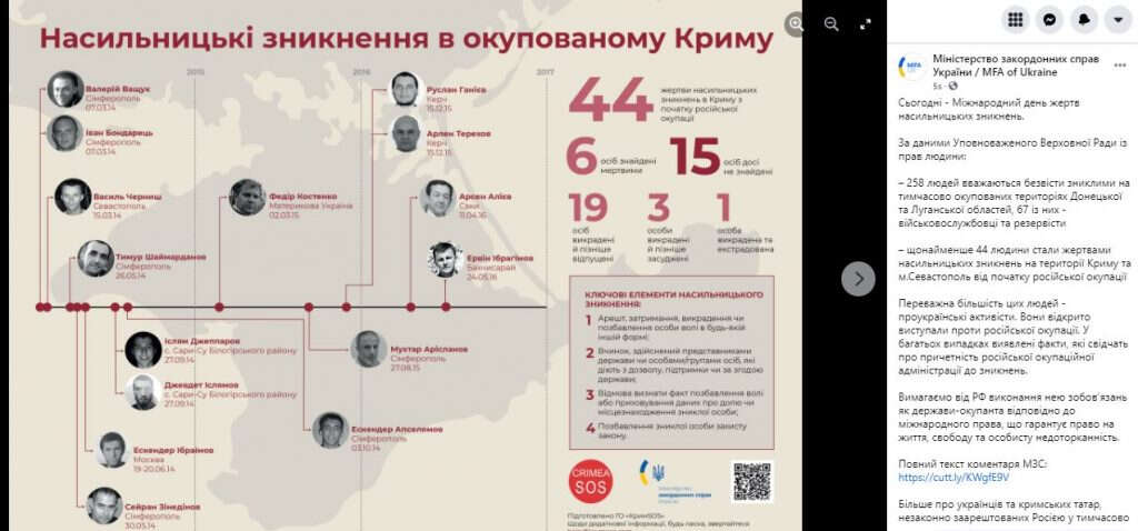 Bakanlık, Facebook sayfasından yaptığı açıklama ile Dünya Kayıplar Günü’ne binaen, 8 yıldır Rus işgalindeki Kırım’daki kaçırılma ve zorla kaybetme vakalarının bilgilerini içeren bir infografik ile birlikte, Ukrayna Dışişleri Bakan Yardımcısı Emine Ceppar'ın Kayıplar Günü'ne ilişkin mesajının bağlantısını paylaştı.