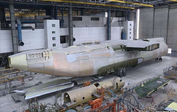 Antonov fabrikasındaki devasa bir havacılık merkezinin ortasında, bugüne kadar bitmemiş uçağın, gövdeye ek olarak bir kanat ve kuyruğu yapıldı.