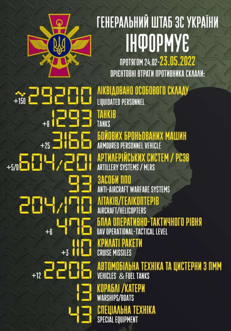 Ukrayna Genelkurmay Başkanlığının bir diğer açıklamasına göre, 24 Şubat’tan 23 Mayıs’a kadar Rus ordusunun son bir gün içindeki 150 civarındaki asker kaybı da dahil olmak üzere yaklaşık 29 bin 200 Rus askeri öldürüldü.