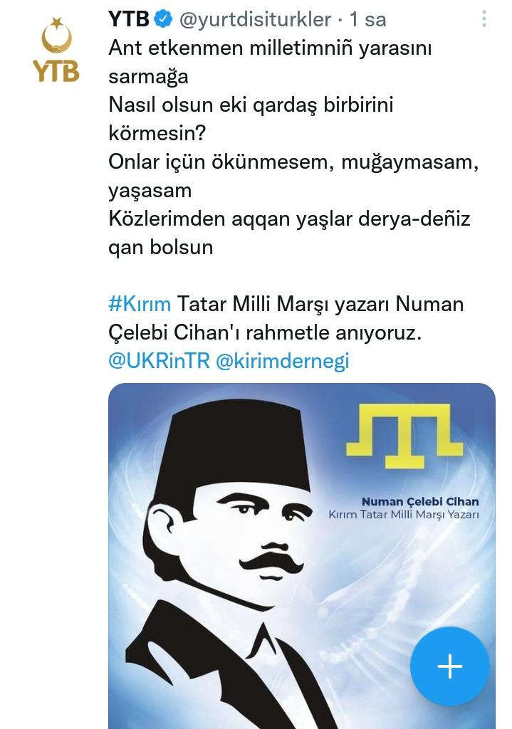 Yurt Dışı Türkler ve Akraba Topluluğu Başkanlığı (YTB), Kırım Halk Cumhuriyeti'nin ilk başkanı, Kırım Tatarlarının antlı şehidi Numan Çelebicihan’ı 104. şehadet yıldönümünde andı. YTB, anma paylaşımında Numan Çelebicihan'ın yazdığı ve Kırım Tatarlarının milli marşı “Ant Etkenmen” dizelerine yer verdi.
