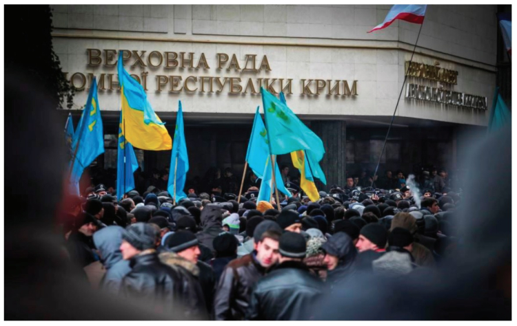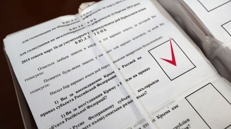 16 Mart 2014 tarihinde işgal altındaki Kırım'da, kamuflajlı Rus askerlerinin gözetimi altında göstermelik bir referandum yapıldı. İki gün sonra, 18 Mart 2014 tarihinde Kremlin’de “Kırım’ın Rusya’ya bağlanması” antlaşması imzalandı. İşgalci Rusya, sözde referandumu yasa dışı hamlesini meşrulaştırmak amacıyla düzenledi.