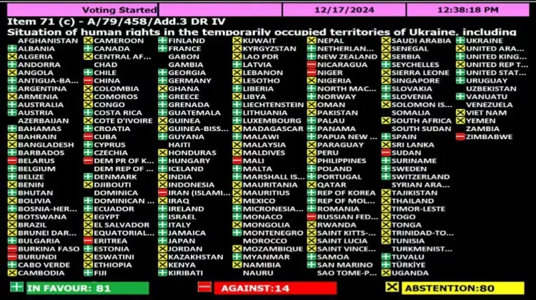 "Kırım Özerk Cumhuriyeti ve Sivastopol şehri de dahil olmak üzere Ukrayna'nın geçici işgal altındaki topraklarında insan hakları durumu" başlıklı karar 81 ülke tarafından desteklenirken, 14 ülke red oyu ve 80 ülke de çekimser oy kullandı.