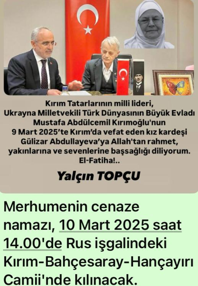 "Kırım Tatarlarının millî lideri, Ukrayna Milletvekili, Türk dünyasının büyük evladı Mustafa Abdülcemil Kırımoğlu'nun 9 Mart 2025'te Kırım'da vefat eden kız kardeşi Gülizar Abdullayeva'ya Allah'tan rahmet, yakınlarına ve sevenlerine başsağlığı diliyorum. El-Fatiha!.."