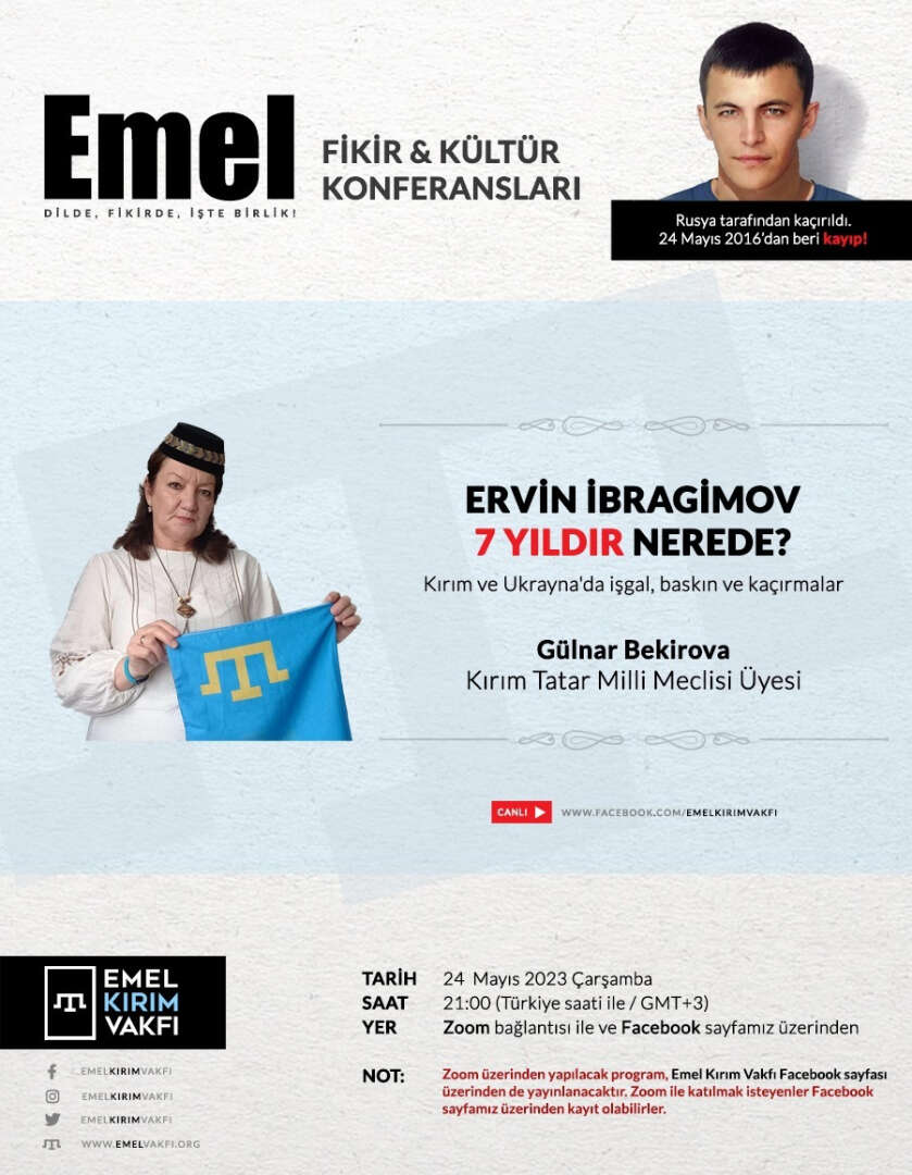 Emel Kırım Vakfı, Kırım Tatar Meclisi Üyesi Gülnar Bekirov'nun konuşmacı olacağı "Ervin İbragimov 7 yıldır nerede?" başlıklı konferans düzenliyor. İbragimov'un kaçırılışının 7. yılında hala hayatta olup olmadığı dahi bilinmiyor. Türkiye'de ve dünyada "Ervin Nerede?" kampanyaları düzenlenmeye devam ediyor.