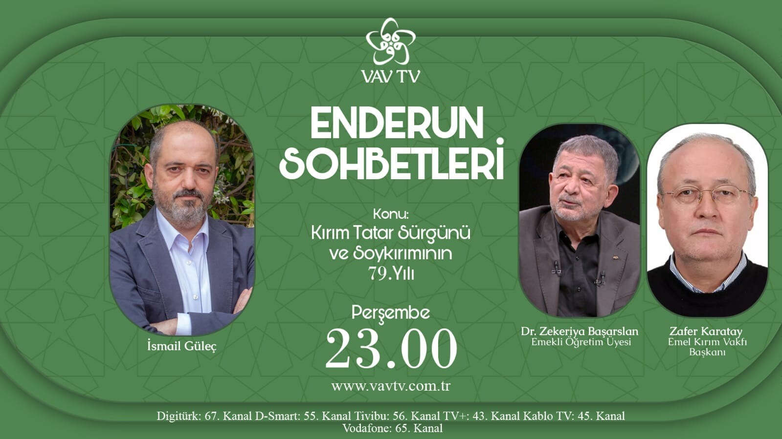 Kırım Tatarlarının anavatanlarından sürgün edilişinin 79. yıldönümü hafızalardaki yerini koruyor. VAV TV'nin Enderun Sohbetleri isimli programında 18 Mayıs 1944 Kırım Tatar Sürgünü ve Soykırımı konuşulacak. 18 Mayıs 1944 Kırım Tatar Sürgünü ve Soykırımı 18 Mayıs Perşembe günü saat 23.00'te başlayan Enderun Sohbetleri Programı ile ekranlara taşınacak.