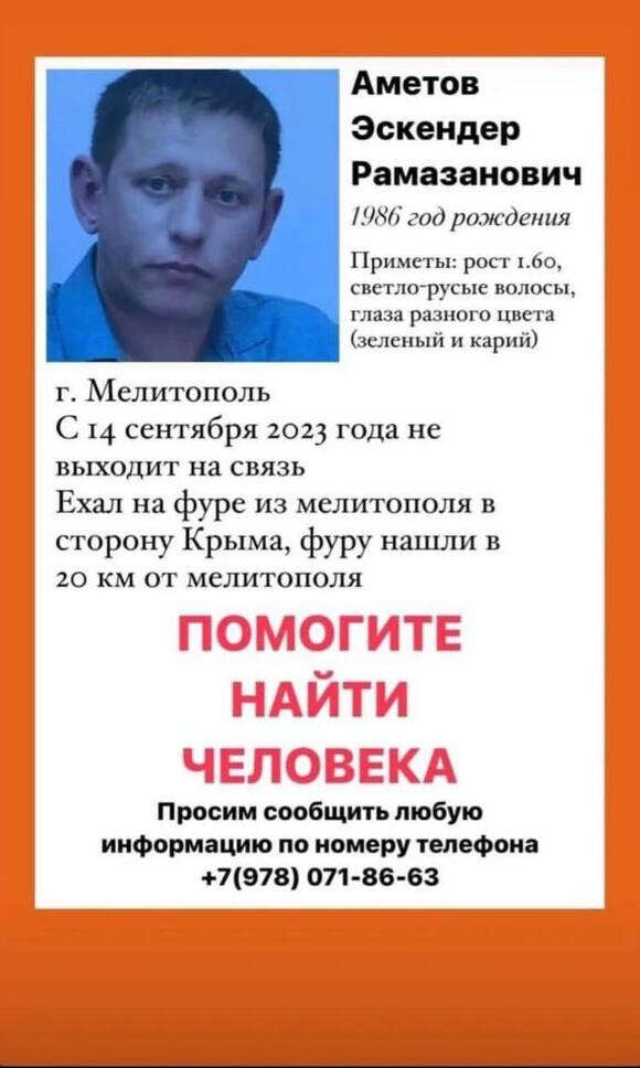 Sosyal medyada yapılan açıklamada, 1986 doğumlu Kırım Tatarı Eskender Ametov’un bir tır ile Melitopol’den Kırım yönünde doğru giderken kaybolduğu bildirildi. Terk edilmiş tırın Melitopl’den 20 kilometre uzaklığında bulunduğunu aktarıldı.