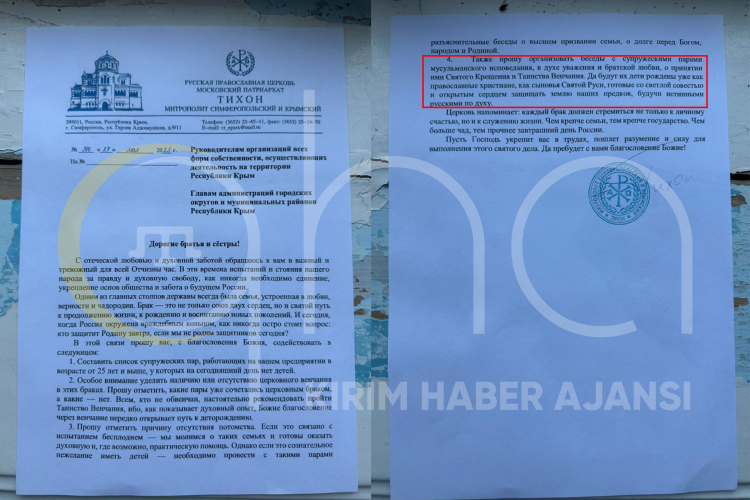 Kırım Haber Ajansının (QHA) elde ettiği belgeye göre, sözde Kırım ve Simferopol (Akmescit) Metropoliti Tihon’un imzasıyla, Kırım’daki Müslüman nüfusa yönelik Hristiyanlaştırma girişimleri başlatıldı.