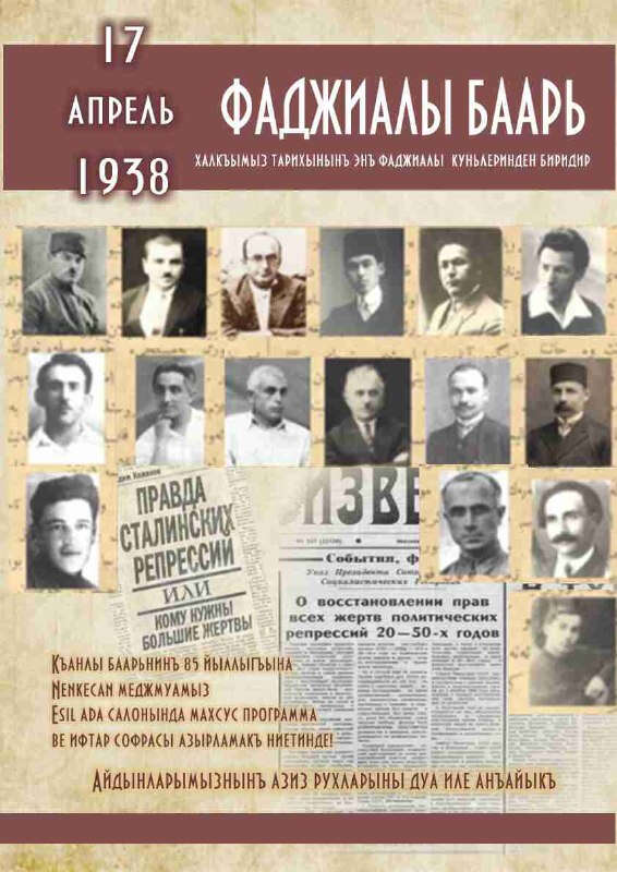 Kırım Tatar tarihinin uğradığı sayısız zulümlerden birinin tarihi olan 17 Nisan 1938'de, 1936 ve 1937 yıllarında çeşitli sebeplerle tutuklanan Kırım Tatar aydınlar takip eden 3 gün içinde, Akmescit’teki cezaevinde Stalin rejiminin katilleri tarafından kurşuna dizilmişlerdi.