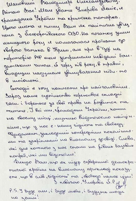 "Sayın Volodımır Oleksandrovıç, sizi selamlıyorum! Benim adım Leniye Umerova, Ukrayna vatandaşıyım ve Kırım Tatarıyım. Bu mektubu size Lefortovo tutukevinden bir siyasi tutsak olarak yazıyorum. Geçen kışın başında hasta babamı ziyaret etmek için Kırım'a gitmeye çalıştım ancak Rusya Federasyonu toprakları girişinde kanunsuz bir şekilde gözaltına alındım. Altı ay sonra, Mayıs ayında ise sahte casusluk suçlamalarıyla karşı karşıya kaldım.
