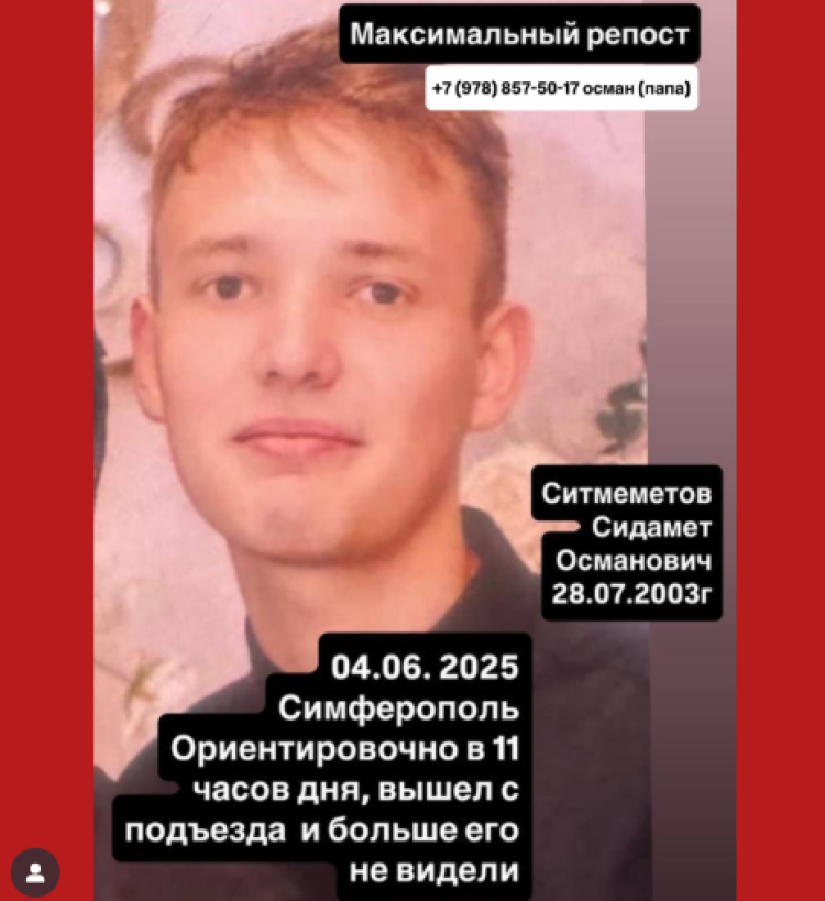 Kırım’da, 2002 doğumlu Sidamet Sitmemetov’un kaybolduğu bildirildi. 22 yaşındaki Kırım Tatarının en son 4 Haziran 2025 tarihinde saat 11.00 civarında yaşadığı apartmandan çıkarken görüldüğü belirtildi.