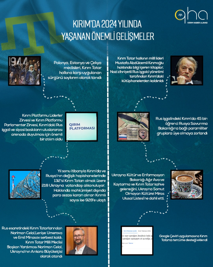 Kırım Tatar halkının ana vatanı Kırım, 2024 yılını da Rusya'nın işgali altında geçirdi. Kırım Haber Ajansı (QHA), Kırım Tatarları başta olmak üzere uygulanan baskıların ve insan hakları ihlâllerinin devam ettiği Vatan Kırım'da 2024 yılının öne çıkan olaylarını okuyucuları için hazırladı.