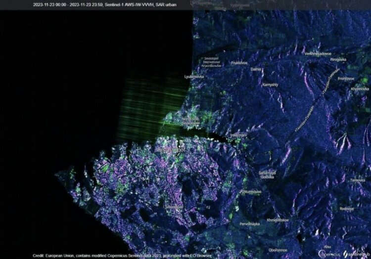 Rus işgalcilerin Akyar’'da askeri tesislerini korumak için çalıştırdığı çok güçlü elektronik savaş sistemleri SAR teknolojisiyle çekilen uydu görüntülerinde “parlamalara” sebep oldu. Defense Express'in haberine göre, 24 Kasım 2023'de çekilen görüntüde bozulma kaydedildi. O gün Rus işgal güçleri, Ukrayna’nın birçok İHA ile Kırım’a saldırdığını duyurmuştu.