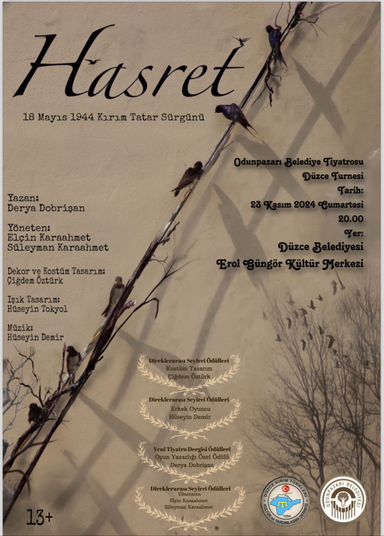 Eskişehir Odunpazarı Belediye Tiyatrosu tarafından icra edilen “HASRET: 18 Mayıs 1944 Kırım Tatar Sürgünü” tiyatrosu 23 Kasım 2024 tarihinde Düzce'de oynanacak.