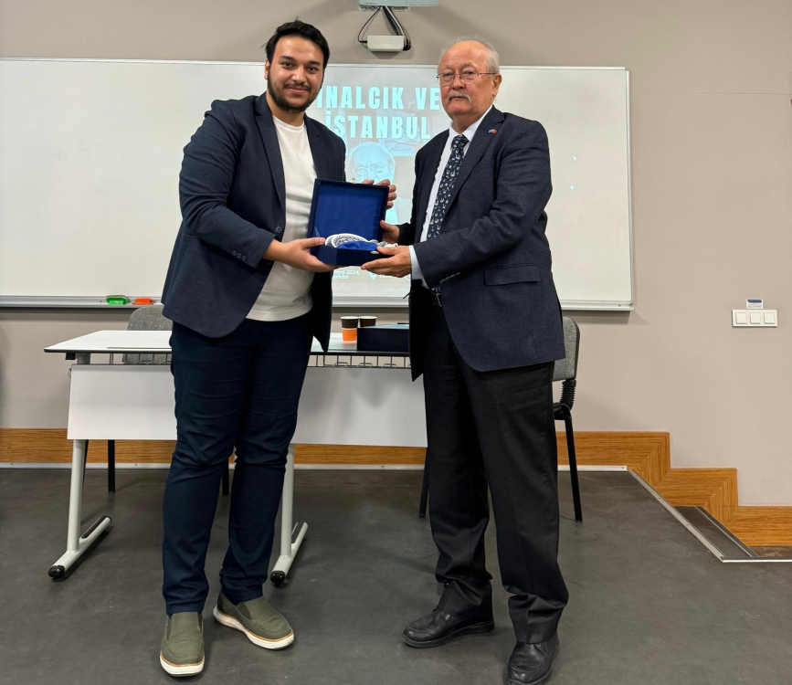 İstanbul 29 Mayıs Üniversitesi Tarih Kulübü Başkanı Oğuzhan Şeker, Zafer Karatay'a teşekkür ederek, günün anısına hediye takdim etti.