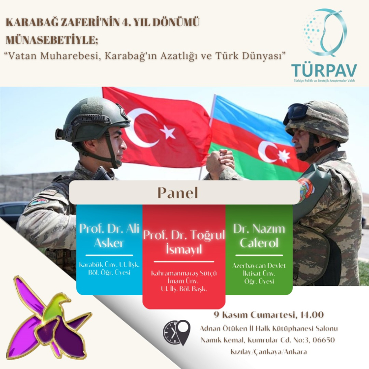 Türkiye Politik ve Stratejik Araştırma Vakfı (TÜRPAV), Karabağ Zaferi'nin 4. yıl dönümü münasebetiyle "Vatan Muharebesi, Karabağ'ın Azatlığı ve Türk Dünyası" başlıklı panel tertip edecek.