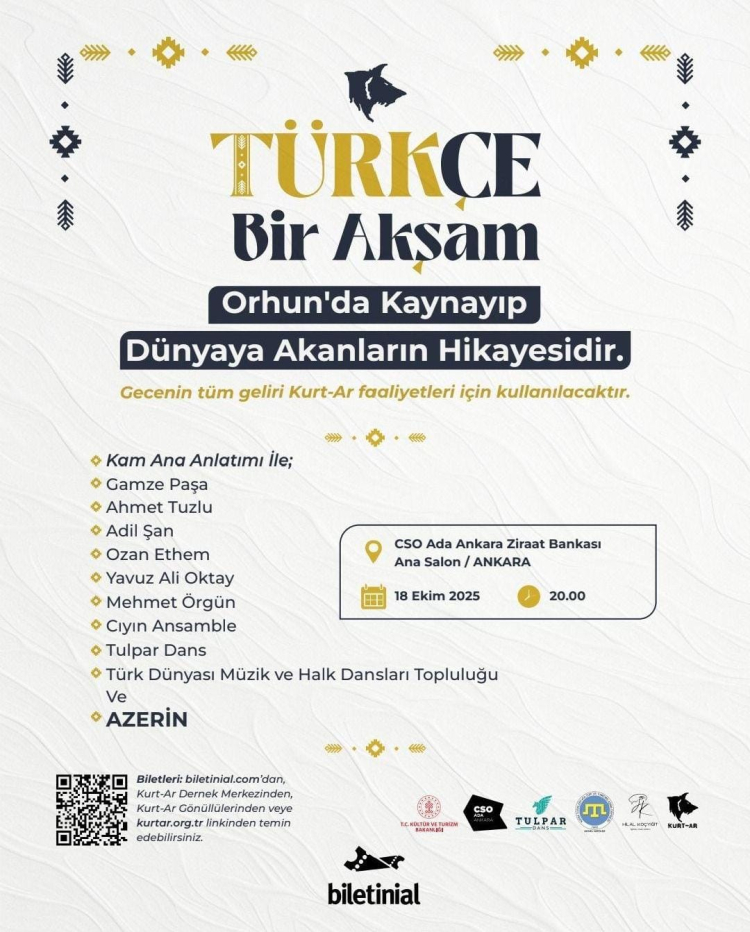 Kurt-Ar Uluslararası İnsanî Yardım Derneği, bu sene de tertip edeceği kapsamlı "Türkçe Bir Akşam" isimli programını duyurdu. Türk dünyasına ait birbirinden renkli dansların ve müziklerin yer alacağı program, 18 Ekim 2025 tarihinde Cumhurbaşkanlığı Senfoni Orkestrası (CSO) Ada Ankara'da düzenlenecek.