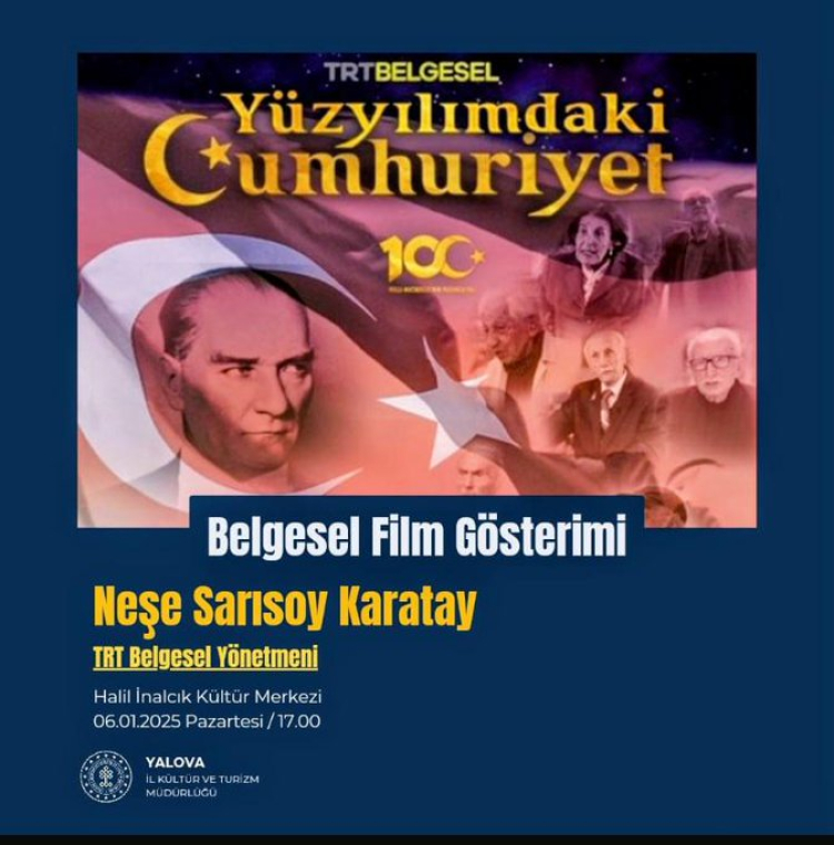 Ödüllü TRT belgesel yönetmeni, yapımcı ve metin yazarı Neşe Sarısoy Karatay tarafından hazırlanan "Yüzyılımdaki Cumhuriyet" isimli belgesel, Yalova'da gösterilecek. 56 dakikalık belgesel, Yalova Valiliği İl Kültür ve Turizm Müdürlüğünün destekleriyle 6 Ocak 2025 tarihinde Halil İnalcık Kültür Merkezinde seyircisiyle buluşacak.