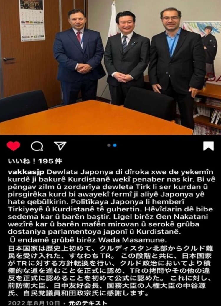 "Japon milliyetçileri 18 Şubat'ta Saitama Eyaleti'nin Kawaguchi şehrinde bir gösteri düzenledi. Burada Kürtler göstericilere PKK'nın V işareti olan orta parmağı gösterdi ve "Japonlar ölsün!" diye bağırdı. Bu olay SNS'lerde yayıldı. Bu gerçek çok tatsız. Ben milliyetçi değilim. Ancak Japon halkının ifade özgürlüğü tehdit altında. İşte bir fotoğraf. Japonya'daki Kürt faaliyetleri konusunda endişeliyim. Sorun şu ki Japon hükumeti harekete geçmekte yavaş davranıyor ve ben de hükümeti eleştirmeye devam edeceğim"