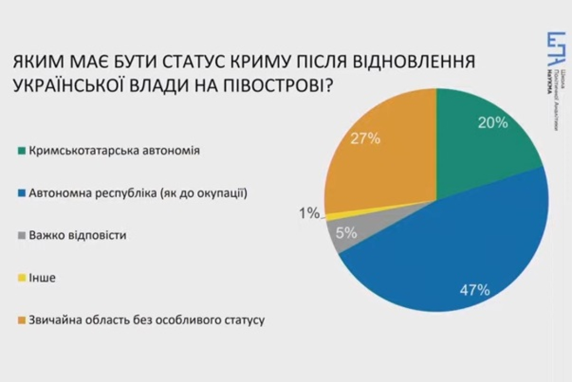 Ukrayna merkezli bağımsız araştırma şirketi Reyting geçen hafta, işgalin sona ermesinden sonra Kırım'ın statüsüne ilişkin sorunun da yer aldığı “Yeniden Entegrasyon ve Sosyal Uyum” başlıklı anketin sonuçlarını yayımladı. Araştırmanın sonuçlarına göre; ankete katılan Ukraynalıların yüzde 47'si, işgalin sona ermesinden sonra Kırım'da 2014'e kadar sahip olduğu özerklik statüsünde kalmaya devam etmesi gerektiğini düşünürken; yüzde 20'si ise özerkliğin niteliğinin değiştirip Yarımada'nın Kırım Tatar özerkliği statüsüne sahip olması gerektiğine inanıyor. Öte yandan katılımcıların yüzde 27’si Kırım’ın "özel statüsü olmayan" bir bölge olması gerektiğini savunurken, yüzde 5'i soruyu yanıtsız bıraktı ve yüzde 1'i sunulan seçenekler dışında bir cevap verdi.