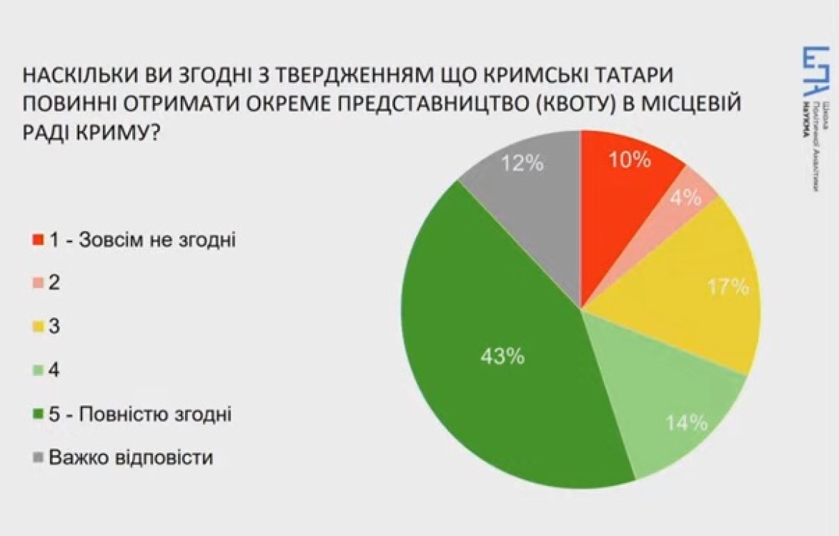 Bununla birlikte ankette, Kırım Tatarlarının Kırım yerel meclisinde özel bir kotaya sahip bir şekilde temsil edilmesi gerektiği hakkındaki ne düşündüğü de soruldu. Bu bağlamda, ankete katılanların yüzde 43'ünün Kırım Tatarlara tanınacak kotaya "tamamen katıldığı", yüzde 14'ünün ise "katıldığı" sonucu ortaya çıktı. Yüzde 57'lik olumlu bakış karşısında ise, yüzde 17'si "hem katılıyorum hem katılmıyorum", yüzde 4'ü "katılmıyorum", yüzde 10'u "hiç katılmıyorum" şeklinde cevap verdi. Anketle katılanların yüzde 12'si ise konuya ilişkin fikir beyan etmedi.