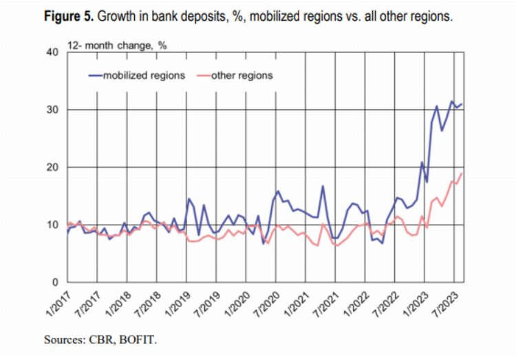 Solanko, araştırmasında Rusya'nın seferberliğinin bölgesel etkisini analiz etmek için bölgesel bankacılık verilerinden elde edilen bilgileri kullandı. Solanko, araştırmasında bazı bölgelerde hane halkı banka mevduatlarında, bölgesel makroekonomik veya kurumsal faktörlere kolayca atfedilemeyecek hızlı artışlar görüldüğünü kaydetti. Kıdemli Danışman Solanko, bu tür bölgelerin orantılı olarak seferber edilmiş askerin fazla olduğu bölgelerle örtüştüğünü vurguladı. Solanko, ciddi yaralanma veya ölüm durumunda sözleşmeli askerlere, seferber edilmiş yedek askerlere ve ailelerine vaat edilen yüksek maaşlar ve yüklü ödemelerin, bölgesel banka mevduatlarında ani artışlar olarak ortaya çıkması makul olduğuna işaret etti.