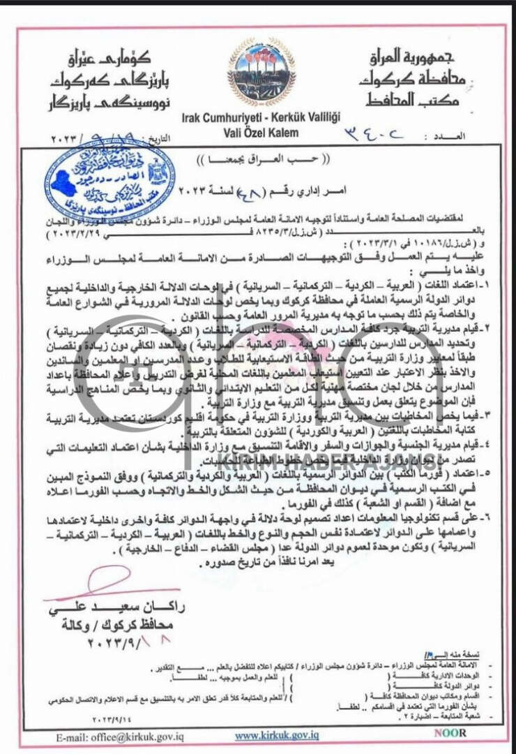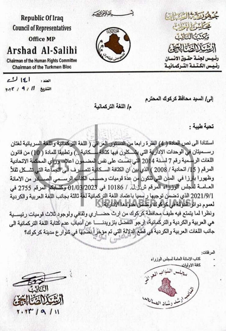 Kerkük Valiliği tarafından 18 Eylül 2023 tarihinde yayımlanan bildiri ile birlikte, tarihten beri Türklerin şehri olan Kerkük’te resmi dairelerdeki yazışmalarda ve dış mekanlara asılan tabelalarda resmi olarak Türkçe’nin kullanılacağı bildirildi. Erşat Salihi, valiliğe gönderdiği dilekçesinde Irak Anayasası'ndaki Arapça ve Kürtçe dillerinin resmi olarak kullanılmasına ilişkin alınan karara dikkat çekerek; Türkçe ve Süryanice’nin de tıpkı diğer diller gibi resmi olarak kullanılmasını talep etti.