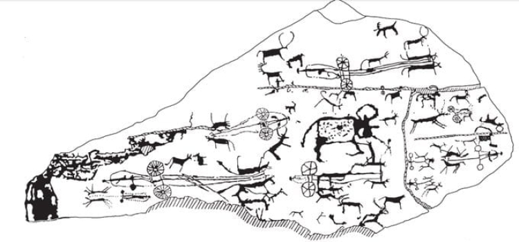 Gök Tanrı inancının etkisiyle güneş ve ışınlı başlı figürler sıkça betimlenir; bunlar çoğu zaman göğe dua eden ya da trans hâlinde tasvir edilen şamanlarla birlikte görülür. Hayat ağacı ise hem evrenin dikey düzenini hem de ruhların göğe yükselişini simgeler. Dağ keçisi, geyik ve at gibi hayvanlar yalnızca av sahnelerinin unsurları değildir; aynı zamanda ruhsal rehberler, totemik koruyucular ve kozmik geçişlerin simgeleridir. At motifi, özellikle dikkat çekicidir çünkü hem öte âleme geçişi hem de göçebe yaşamın kutsallığını temsil eder. Kurt figürü ise en eski dönemlerden beri soyun koruyucusu, dirilişin ve yol göstericiliğin sembolüdür. Bunların yanı sıra güneş diskleri, üç katlı evreni anlatan kompozisyonlar, insan-hayvan karışımı figürler ve dans eden ya da dua eden topluluk sahneleri de mitolojik düşüncenin ritüel yansımaları olarak karşımıza çıkar. Kısacası, Türk kaya sanatı yalnızca görsel bir anlatım biçimi değil, mitolojik evren tasavvurunun taşa kazınmış hali gibidir; her figür, bir inancın, bir kozmolojinin ve bir kimlik bilincinin sembolik izini taşır.