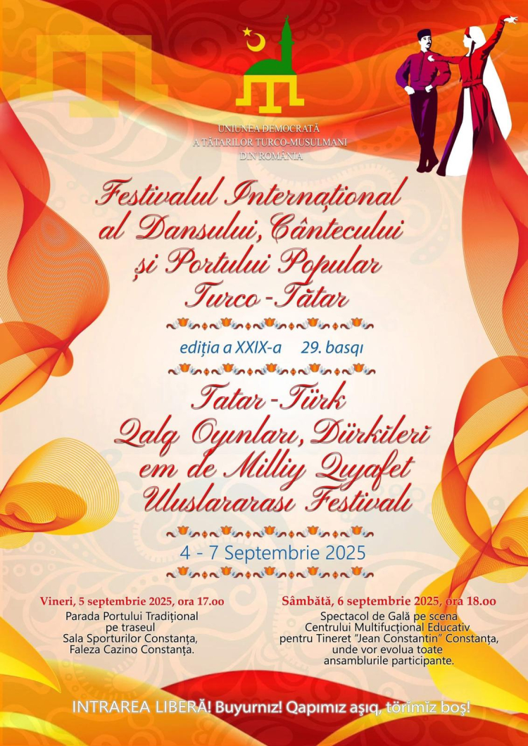 Romanya Müslüman Tatar Türkleri Demokratik Birliği tarafından 4-7 Eylül 2025 tarihleri arasında tertip edilen 29. Uluslararası Türk Tatar Millî Kıyafet, Halk Oyunları ve Türkiler Festivali kapılarını açtı.