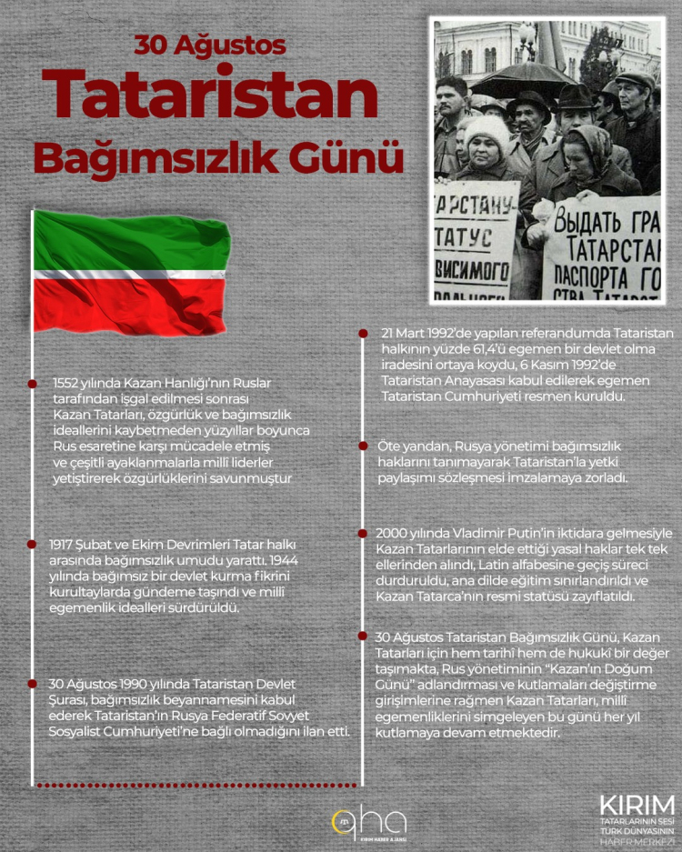 30 Ağustos 1990 tarihinde Tataristan’ın bağımsızlık beyannamesi kabul edildikten sonra o gün Cumhuriyet Bayramı, Bağımsızlık Günü olarak kutlanmaya başlandı. Rusya o günden bugüne Tataristan'ın bağımsızlığını baltalayacak hamlelerde bulunuyor.