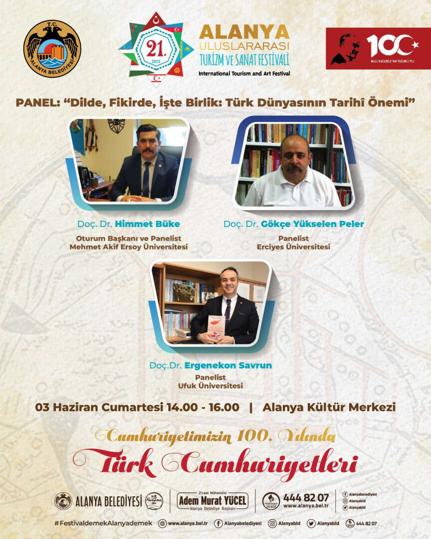 Antalya Alanya Belediyesi tarafından organize edilen Alanya Uluslararası Turizm ve Sanat Festivali'nde, "Dilde, Fikirde, İşte Birlik: Türk Dünyasının Tarihi Önemi" başlıklı panel yapılacak.