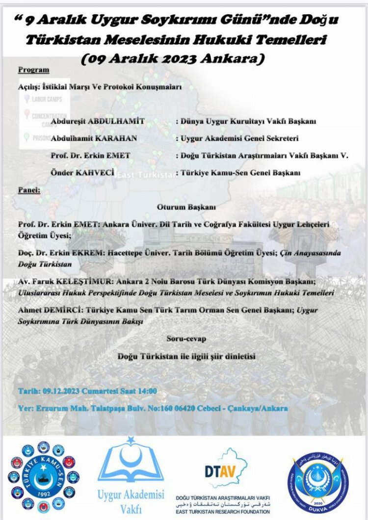 Türkiye'nin başkenti Ankara'da "9 Aralık Uygur Soykırımı Günü" dolayısıyla, Dünya Uygur Kurultayı Vakfı, Doğu Türkistan Araştırmaları Vakfı ve Uygur Akademisi tarafından 9 Aralık 2023 tarihinde, Doğu Türkistan'daki son durum ve Doğu Türkistan meselesinin hukuki temellerinin ele alındığı bir panel düzenlenecek.