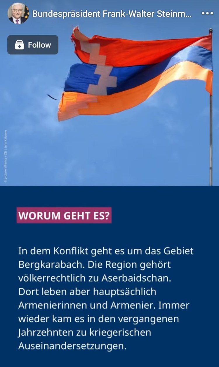 Mektubunda, "Kısa bir süreliğine, Azerbaycan'ın bir bölgesini referans alan bir bayrağın yanlış tasviri ve beraberindeki metin Federal Cumhurbaşkanının sosyal medyasında yayınlandı. Hata tespit edildikten sonra gönderi derhal geri çekildi. Teknik bir hata nedeniyle yayımlanan yazının, Almanya'nın Azerbaycan'ın toprak bütünlüğüne ilişkin bilinen tutumu açısından hiçbir önemi bulunmamaktadır. Bu hatadan dolayı çok mutsuzum. Gönderinin Azerbaycan'daki bazı insanlarda yarattığı yanlış izlenimden dolayı içtenlikle özür dilemek istiyorum. Federal Cumhurbaşkanının önümüzdeki ziyareti, Azerbaycan-Almanya ortaklığını güçlendirmeyi ve bölgede devam eden barış sürecini desteklemeyi amaçlıyor." ifadelerine yer verdi.